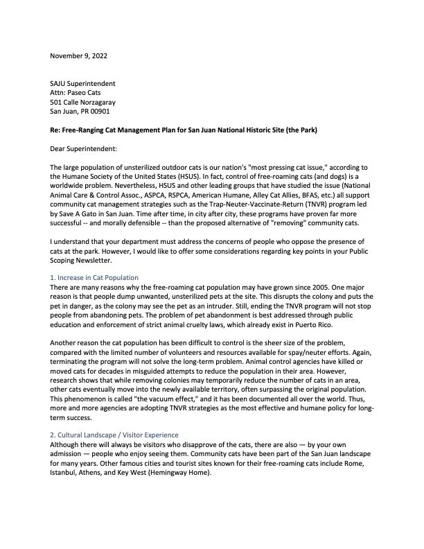 The National Park Service is planning a strategy for management of free-ranging cats at the historic site at Old San Juan. The cats are part of a trap-neuter-vaccinate-return (TNVR) program, but the park’s proposed action involves removing the cats. (Exactly what that means is unclear.) Anyone interested in commenting is invited to do so by 11-22-2022.