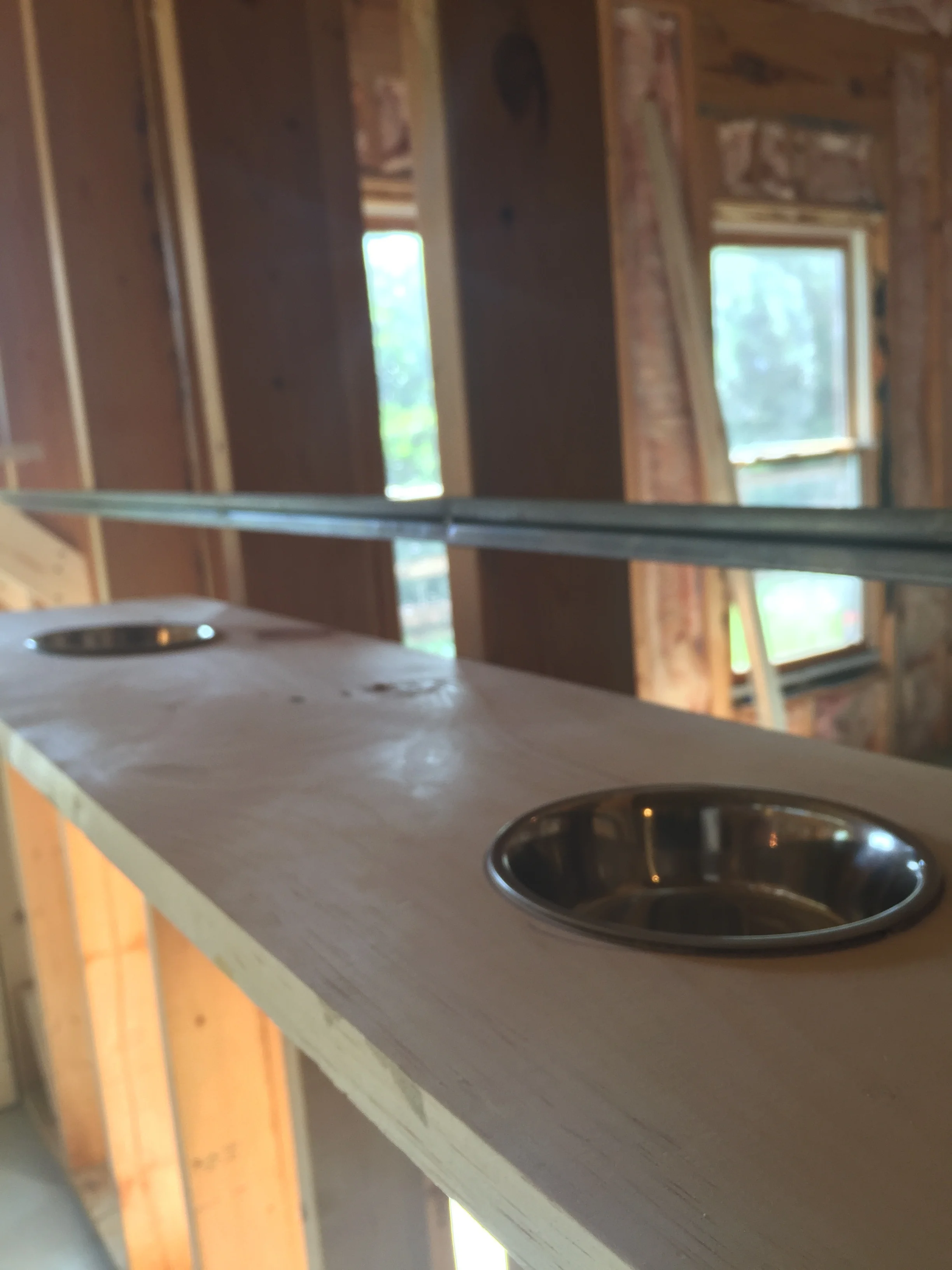 Cat-feeding shelves with recessed bowls are a good way to keep cat food away from dogs. Copyright: Pet-Friendly Planning 2019.